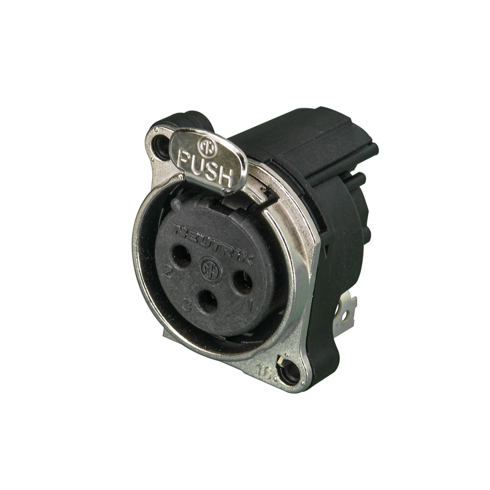3 pole female XLR receptacle, grounding: mating connector shell to pin1 and front panel, horizontal PCB mount Same as A series with exception of a metal mounting flange featuring continuous circumferential ground contact to chassis for best EMC practice. UL recognized component.