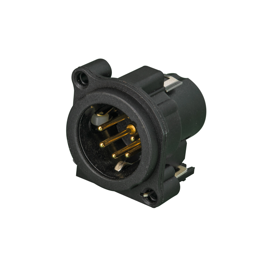 5 pole male XLR receptacle, grounding: separate ground contact to mating connector shell and front panel, vertical PCB mount The 'State of the Art' receptacle. Round plastic body XLR PCB mount panel connector. These have the smallest size and highest packing density (23 mm between centres).